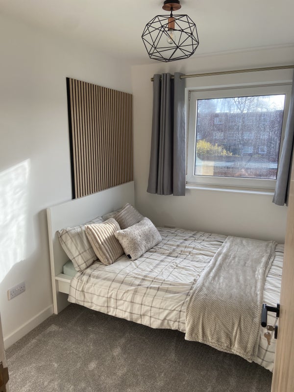 A beautifully presented double room available in a modern, recently updated apartment. The property has a bright open-plan living and dining area, a stylish kitchen, and a luxury media wall with TV and electric fireplace, creating a comfortable and sociable living space.