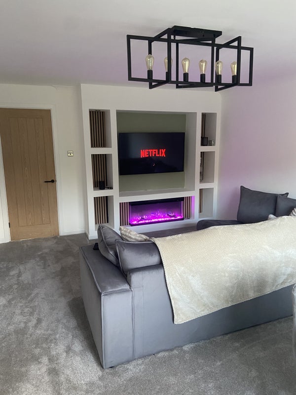 • Feature media wall with mounted TV and electric fireplace