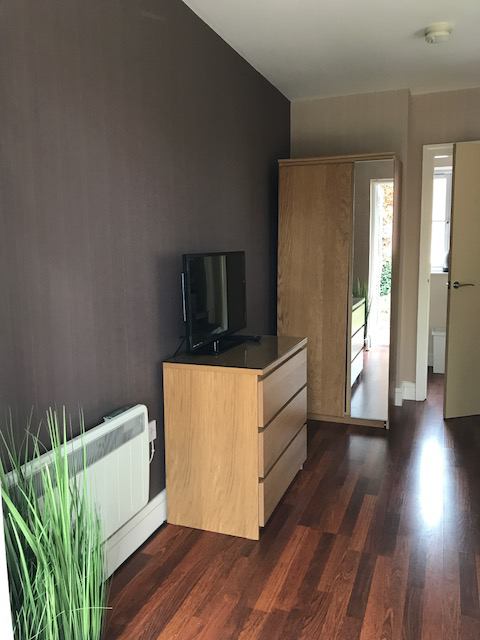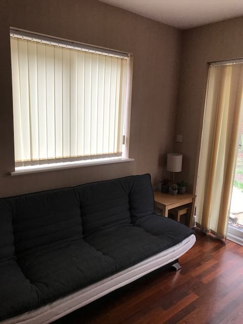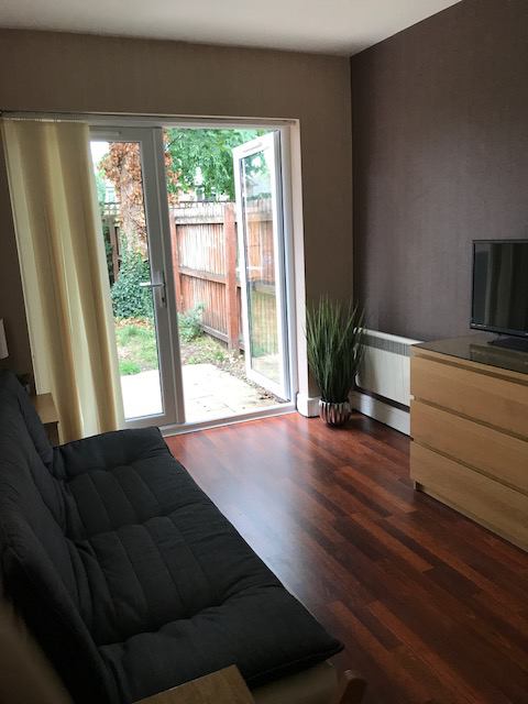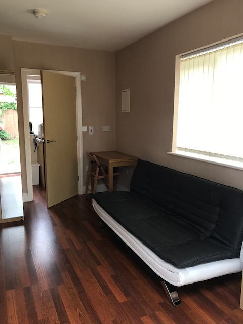 Living room/bedroom with comfortable new 3/4 sofabed, chest of drawers and wardrobe. TV & Wifi provided.