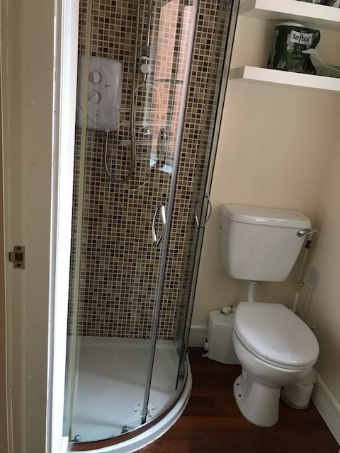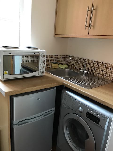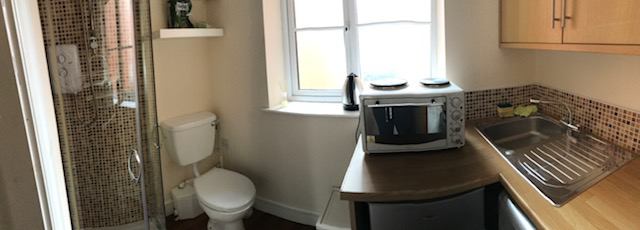 Bathroom with electric shower and toilet. Small kitchenette with mini oven & two hobs, fridge-freezer and washer-dryer. Bathroom/kitchenette are combined.