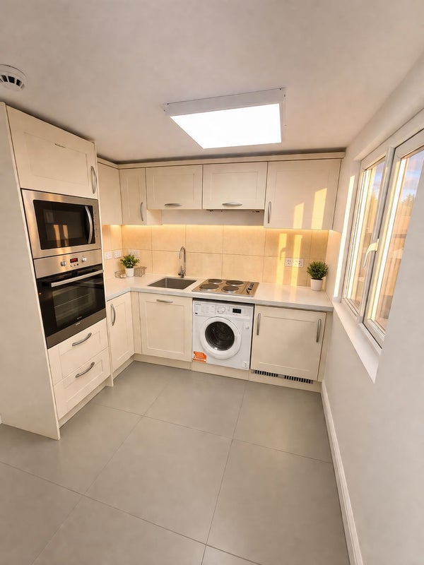 Brand-new kitchen with oven, hob, extractor, integrated washing machine, and fridge/freezer. Ample storage and a modern design.