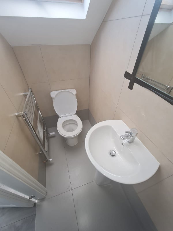 Fully equipped with a sink, toilet, towel rail, and shower with premium sanitary ware.