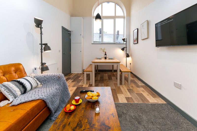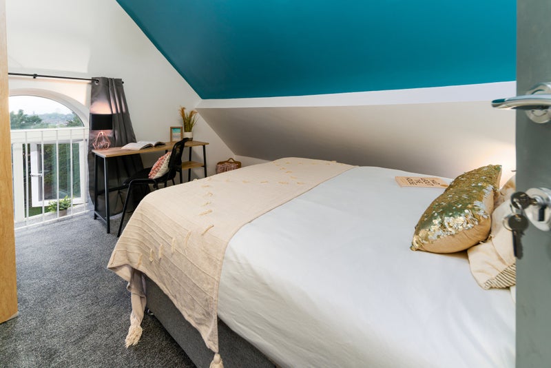 A bright, stylish space with a double bed, wardrobe, desk, and bedside table – everything you need to move in straight away.