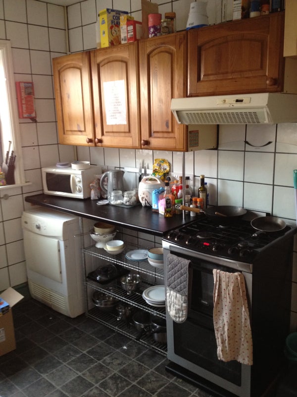 It has 4 good sized furnished double bedrooms each ( the front one huge with giant beanbag and circular bamboo 60"s seat) with an IKEA double metal bed frame, IKEA double mattress and double mattress cover, large desk, swivel desk chair, hanging unit, coat rackchest of draws, carpet and black "Blackout" roller blind.