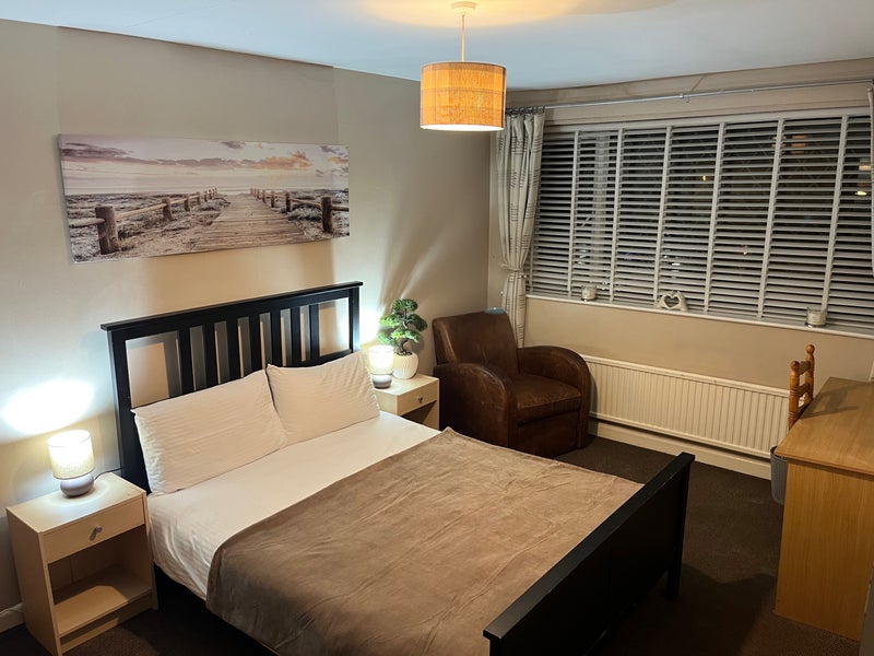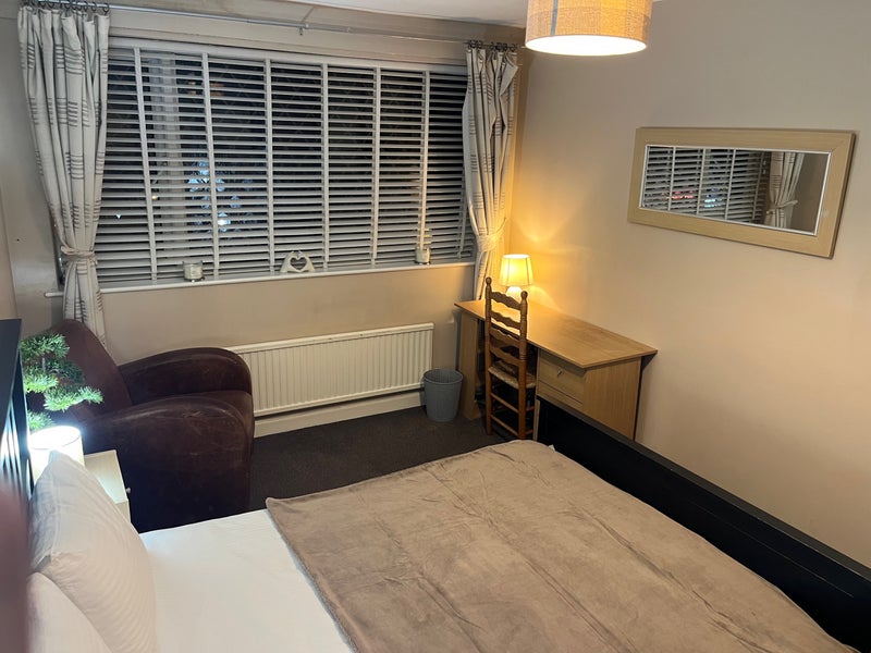 TV Aerial In the room, leather arm chair, desk and chair, double frame bed, 2 x large fitted wardrobe, set of 4 drawers and bedside tables.
