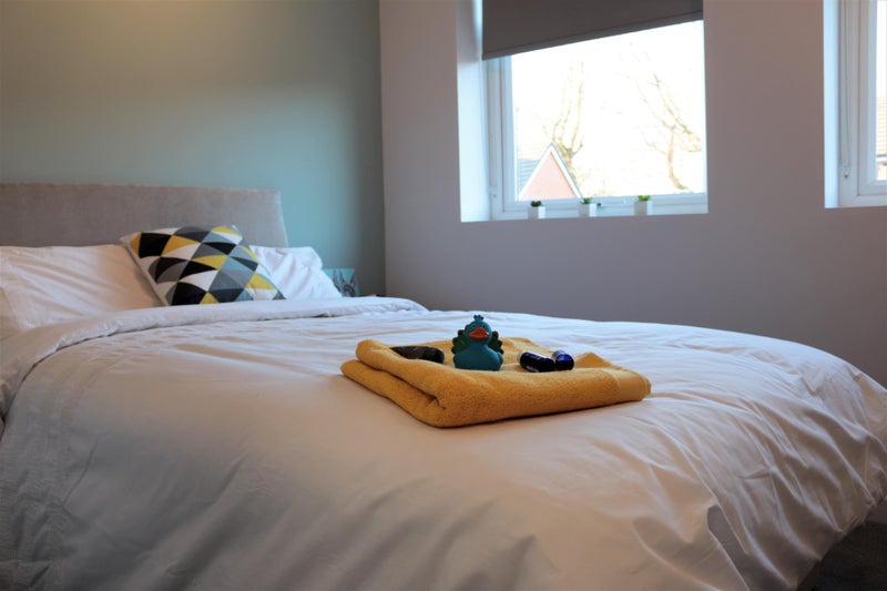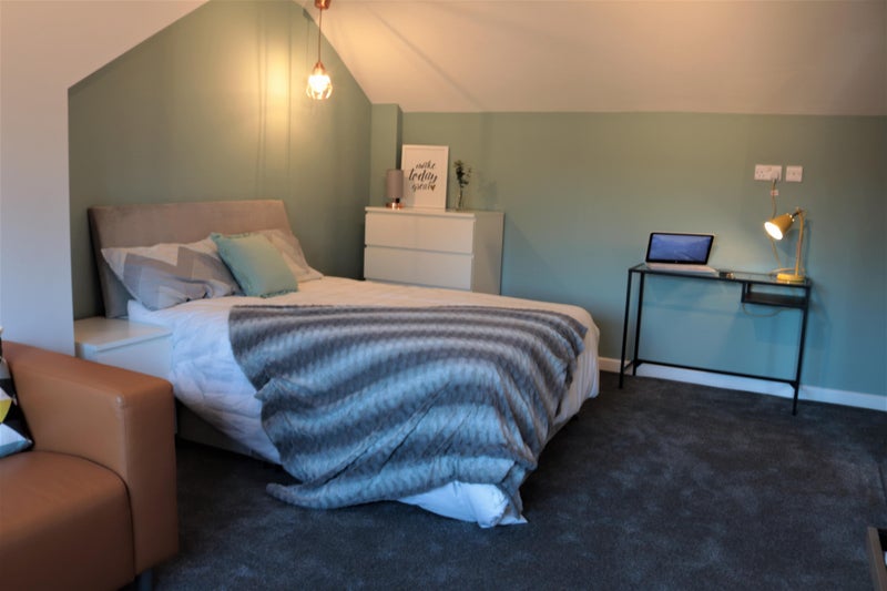 The brand new bedroom furniture includes a new bed and mattress, wardrobe, bedside table, lamp, desk and funky chair!