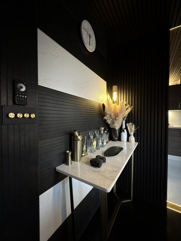 - dining room - luxury features including marble table, marble console bar and marble side table, in ceiling speakers, corner Philips HUE lights, ceiling covered in acoustic panels