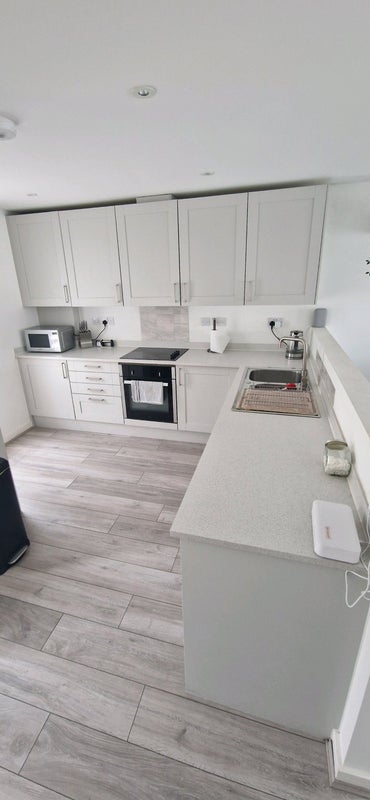 Kitchen complete with: kettle, stove, microwave, dishwasher, fridge and freezer.