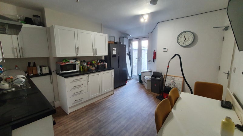 This 5-bed house share has a lovely, modern shared living room/kitchen, a large fridge freezer and a washer.