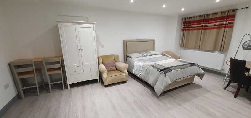 A brand new large, modern, and spacious studio room typically features a fully furnished, open-plan design with contemporary furnishings, a kitchenette, and an en-suite bathroom. These rooms often include ample storage solutions like wardrobes and under-bed storage, as well as amenities such as a desk area, TV, and in some cases, integrated appliances like a fridge-freezer and microwave. Modern developments may also offer additional features like a private gym, rooftop terrace, and good transport links.