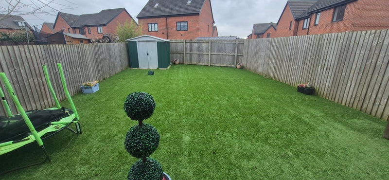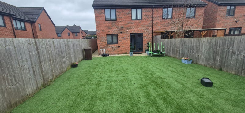 Large, low-maintenance garden with artificial turf—perfect for relaxing, play, or outdoor dining