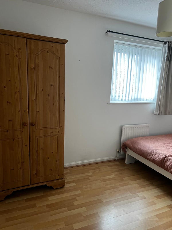 • Small double bedroom with hard flooring, furnished with a bed, bedside table and wardrobe.