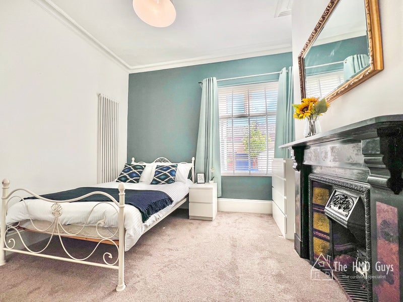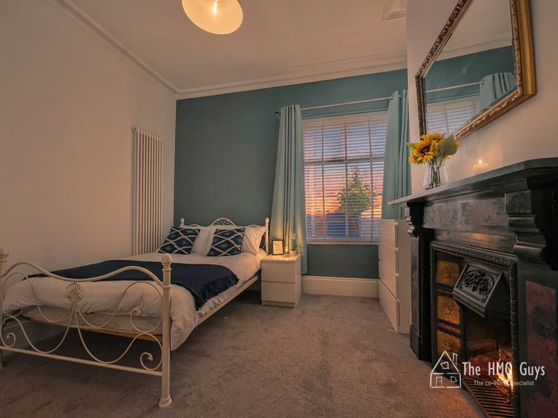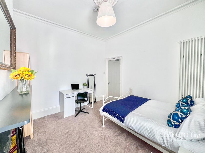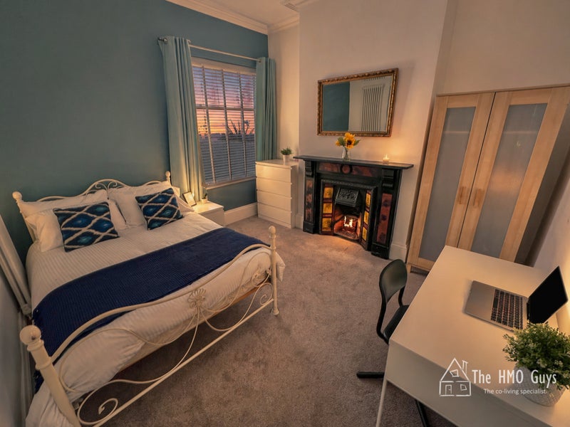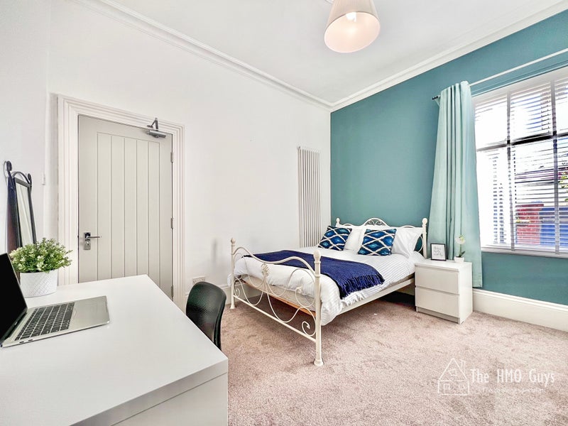 A comfortable double bedroom, freshly decorated and ready to move into. You'll have a desk, chair, bed, wardrobe, bedside table and drawers — everything you need to settle in straight away. Superfast fibre optic broadband is included throughout the house.