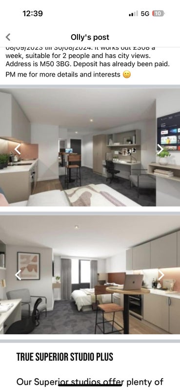 Hey guys, I have a studio flat available in True student accommodation (True Salford Two) move in date 08/09/2023 till 30/08/2024. it works out £308 a week, suitable for 2 people and has city views. Address is M50 3BG. Deposit has already been paid. PM me for more details and interests 🙂