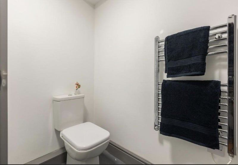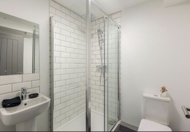 A stylish, en-suite modern shower room with a large shower and shower head, wash basin and toilet. Your shower room also comes with a heated, chrome towel rail.