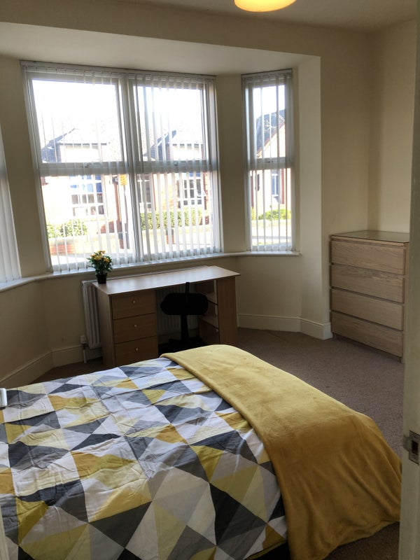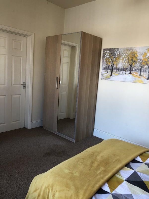The room is furnished with light oak wardrobes, drawer packs and bedside table with a faux leather double bed complete with high quality orthopedic mattresses. There is also a work desk and chair. There is a TV point, superfast broadband and plenty of socket outlets