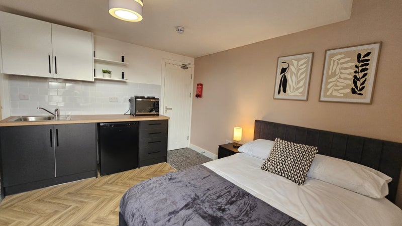 Everything is brand new: double bed with ottoman storage, wardrobe, drawers, electric height adjustable desk and chair, plus your own stylish en‑suite and in‑room kitchenette with sink, fridge‑freezer and combination oven/hob cooking.