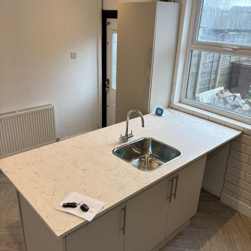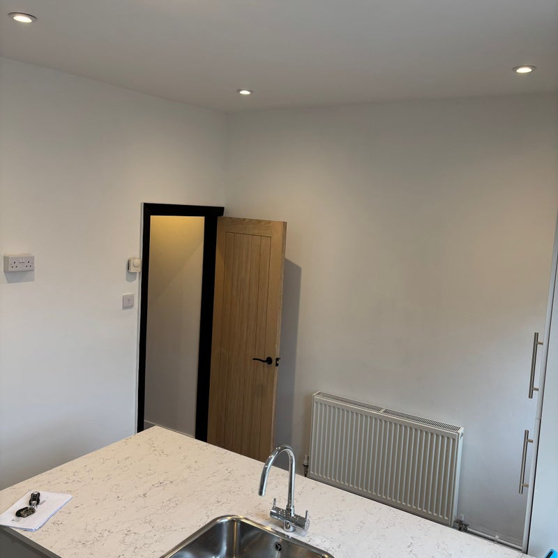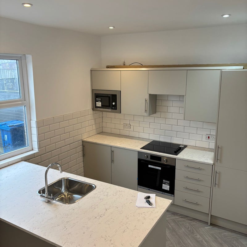 ● Modern kitchen with space for a washing machine, fridge freezer, cooker, and microwave (appliances not currently supplied).