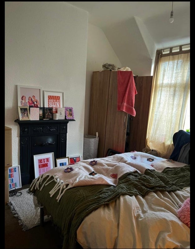 The room is in a four bed flat, which is split over two floors. This is a top floor bedroom which comes furnished with a double bed, bedside cabinet, chest of drawers and wardrobe.