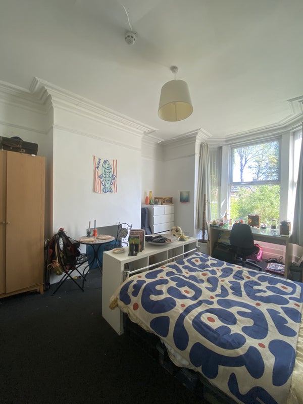 A large ground floor double room with a bay window in a shared 7-bed / 2-bathroom West Didsbury house. Less than 5 minutes walk to Burton Rd & 2 tram stops.