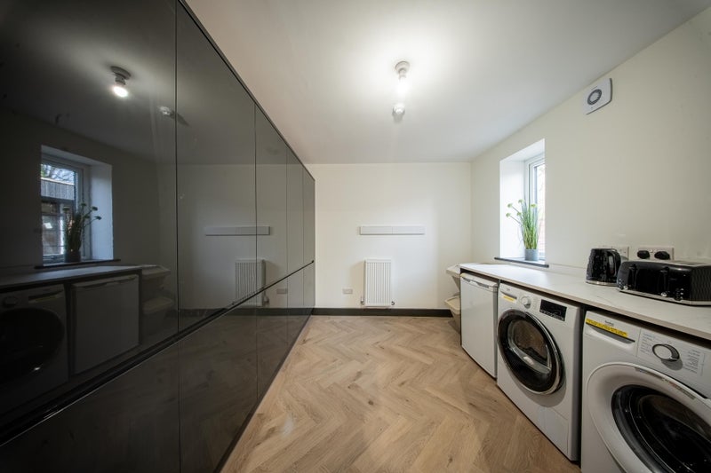 The kitchen and utility are fully equipped for immediate move-in, including a large fridge and freezer, plates, cutlery, washing machine, and tumble dryer.