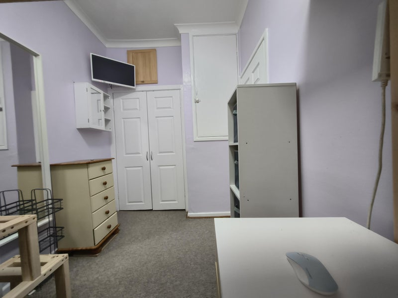 There is space in the room for a fridge freezer, microwave, and coffee machine, and this is my preferred setup to create a more self-contained, “room-only” living arrangement. The kitchen is still available for occasional use (e. g. cooking meals), but the room is best suited to someone happy with a more independent setup.