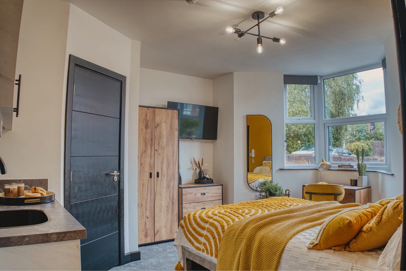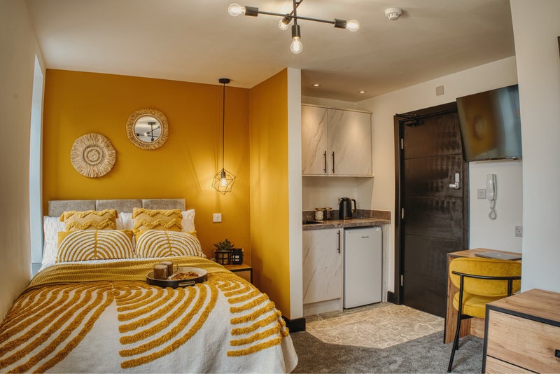 Each room is fully furnished with an en-suite bathroom, a comfortable double bed, and a dedicated workspace, ensuring a seamless transition between work and relaxation. Studio rooms also available containing a kitchenette (tea & coffee bar).