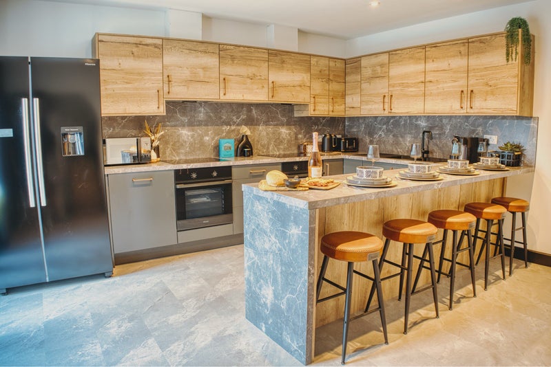 The property boasts modern amenities, including a fully equipped kitchen/diner with washer, dryer, double hobs (8 hobs), double ovens, American style fridge/freezer (with cold water dispenser), high-speed broadband, and a 43" smart TV in both the communal kitchen/dining area and each bedroom.