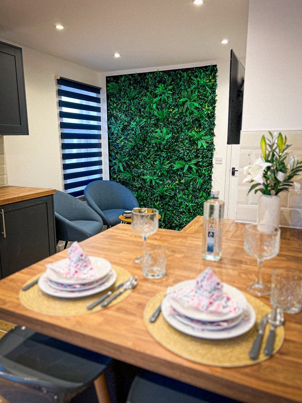 ✔️ Relaxation corner with comfy chairs and a feature grass wall - a unique, calming touch