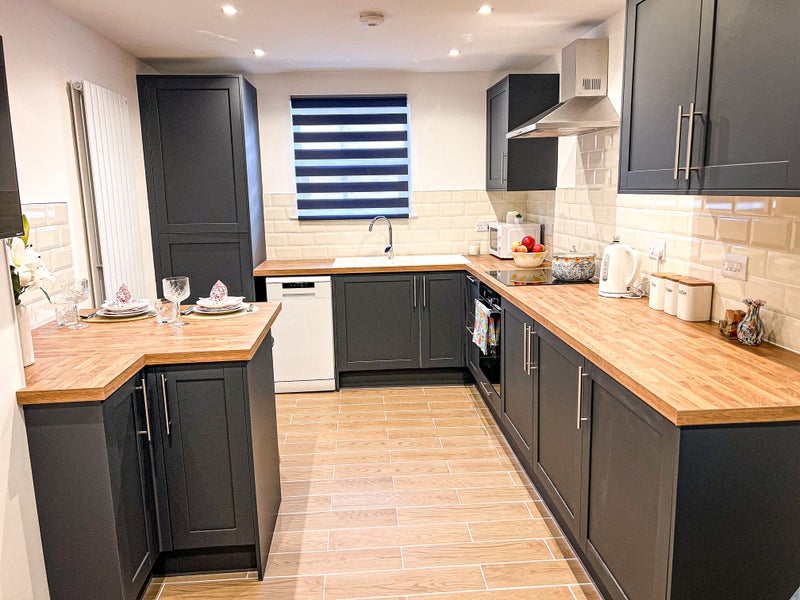 ✔️ Stylish wooden worktops, modern dark cabinets, and quality appliances