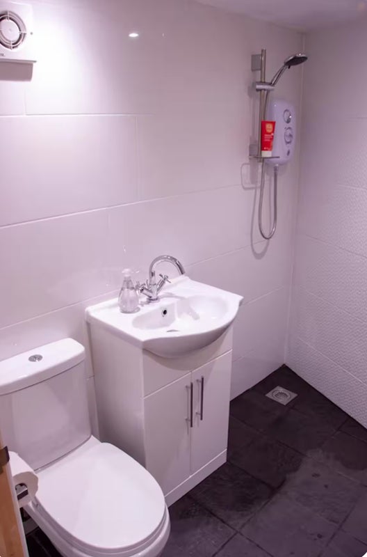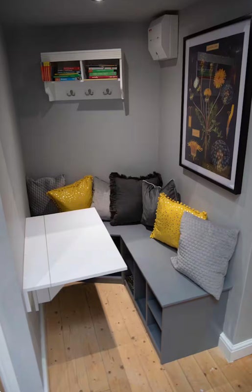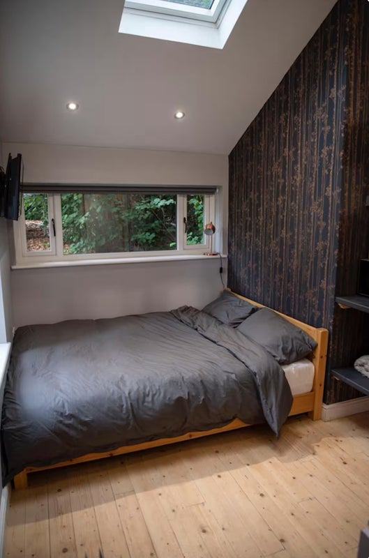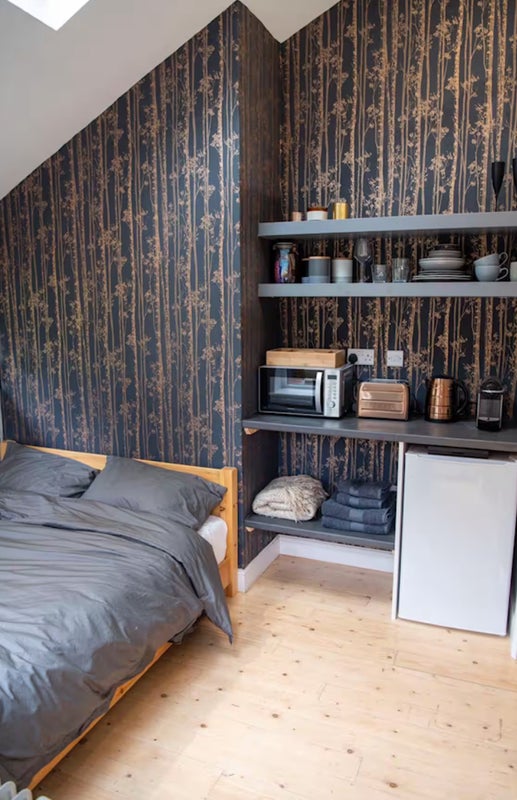 This is our guest room, at the bottom of the garden. We (myself, husband and two children) live in the main house but we have a lodge available for rent. The lodge has a king size bed, seating area, wet room and microwave/kettle/toaster. This would be ideal for someone working up here during the week or needing part time accommodation. It’s very small but entirely self contained and a really beautiful space.