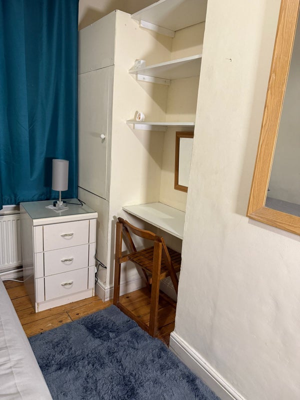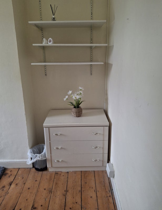 TV aerial point in bedroom. Large wardrobe and lots of shelving.