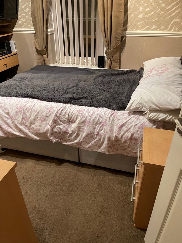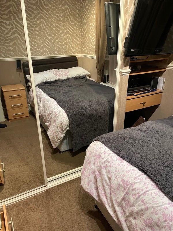 Double bedroom with desk and fitted wardrobes.