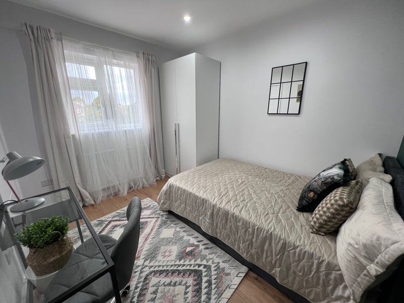 Room 3. Double bedroom on the first floor benefits from brand new En-Suite (shower cabin, toilet and basin). New mattress and ottoman velvet bed with extra storage, Ikea wardrobe and chest of drawers, desk and a chair and lovely designer textiles and wall decorations. £750/month