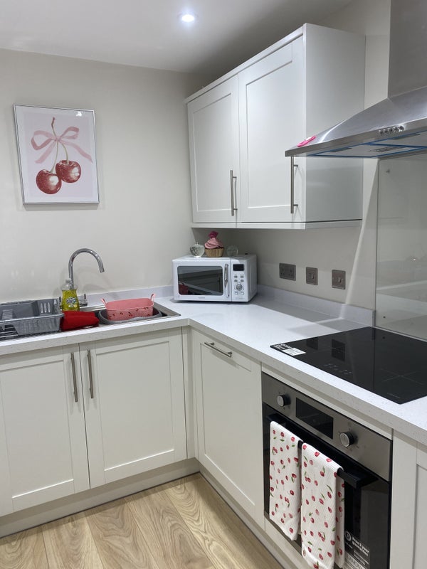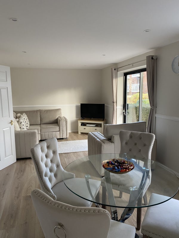 A bright, modern ground-floor flat with an outdoor patio area. The flat is ideally located: a 5-minute walk to the town centre, minutes from the train station/bus stop (direct train to London Waterloo), and close to a local pond - perfect for summer/evening walks. Includes an allocated parking space if needed.