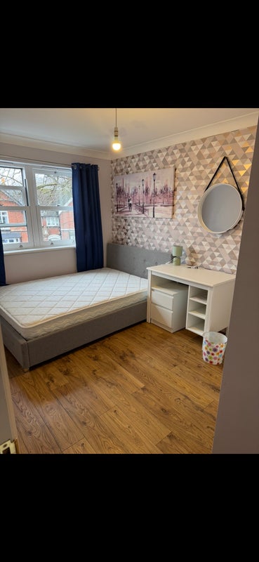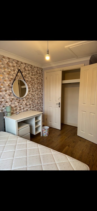 - Room is double bedroom, fully furnished with bed frame, mattress, bedside table, dressing table, built-in wardrobe, and mirror