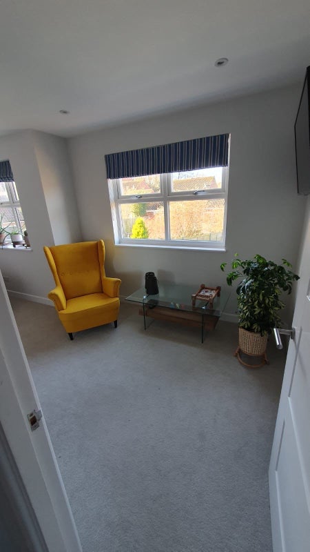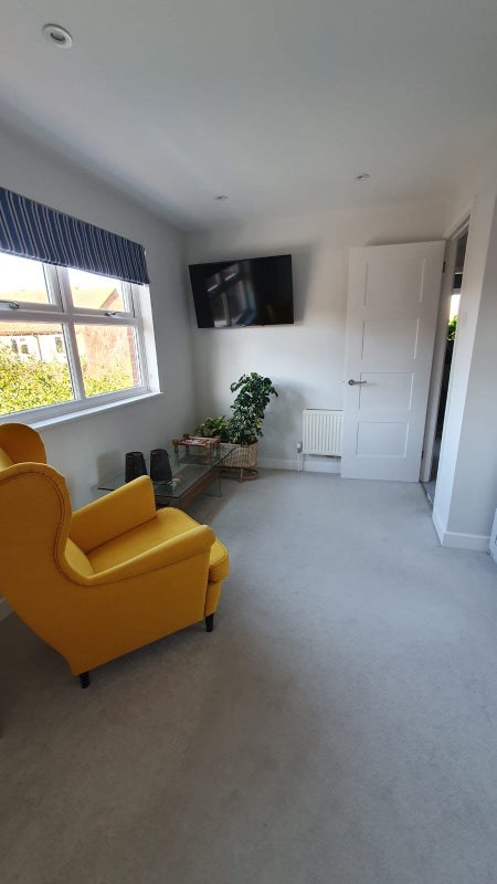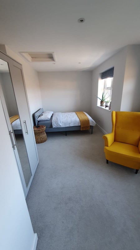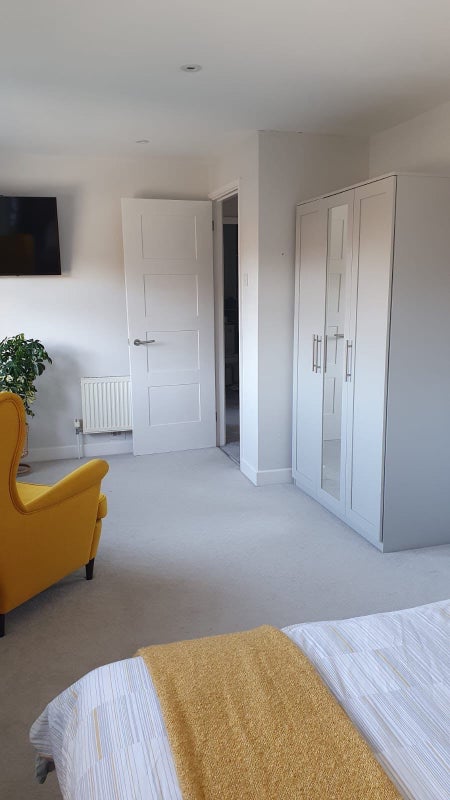A very large double bedroom with tv and space for coffee table and armchair. Access to kitchen and bathroom. Bathroom is just for the tenant ( en-suite)- not shared with the landlord.