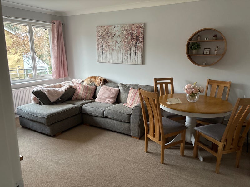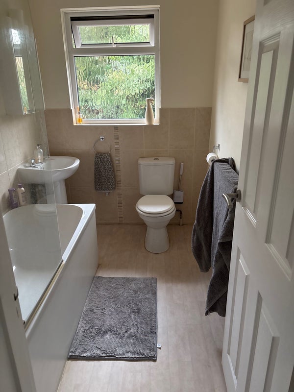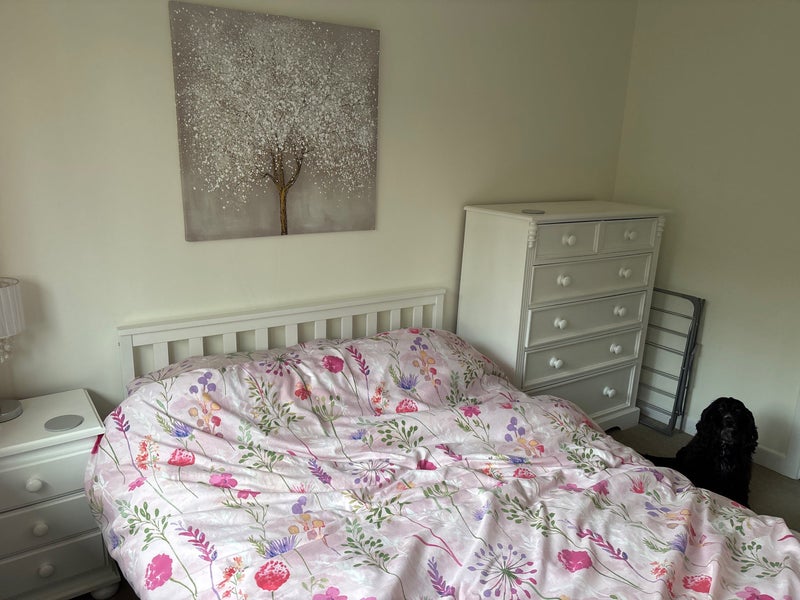 Bright sunny room in quiet location. Shared lounge kitchen and bathroom in 2 bed flat. Garden and parking. Two dogs live here. Near to M3 and M27 links