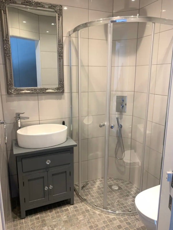 The en-suite has a heated floor, rainfall power shower, toilet, basin and storage cabinet.