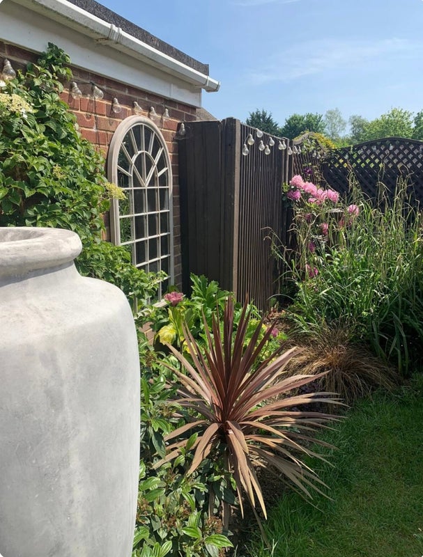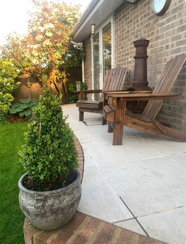 Garden with dining table, easy chairs, lighting for sitting out on a summer evening.