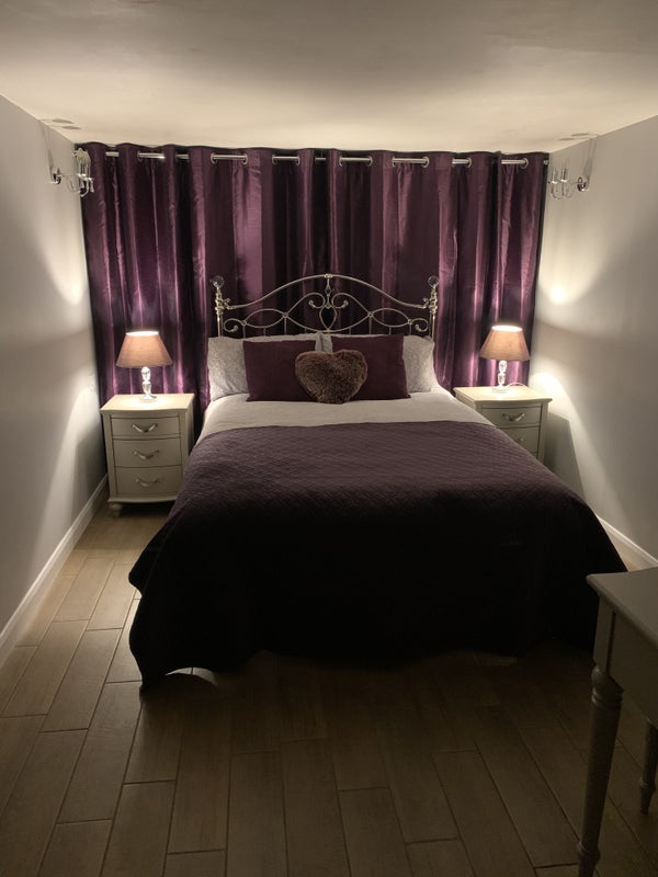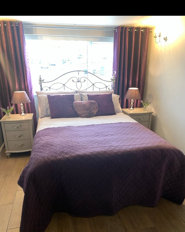 The bedroom is south facing so is bright, and has blackout curtains, window blinds, bedside cabinets, dressing table, hanging space and cupboards. TV and easy chair. Full length mirror.