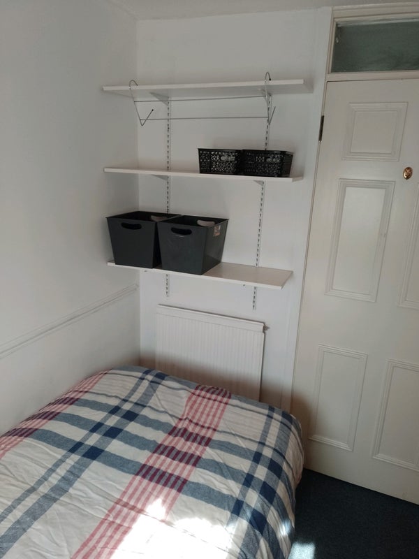 Single room with a single bed with headboard, 1 Bedside lamp, Large picture window, Carpeted, Mirror over work top with a chair underneath to operate computer on worktop, Fitted wardrobe, & other storage units in the room + 3 shelves on the wall at the end of the bed,,,