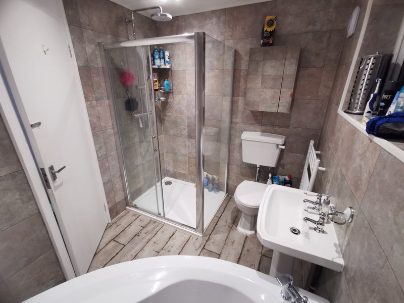 Large shared newly fitted bathroom with power shower and corner bath. Only one other person will be sharing the main family bathroom.