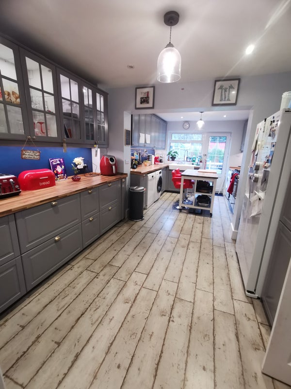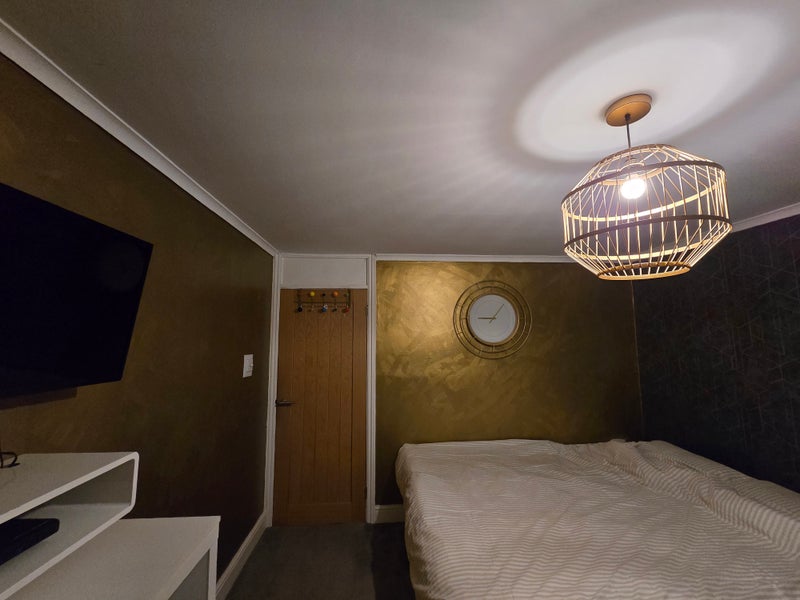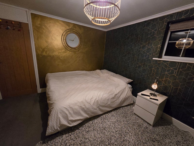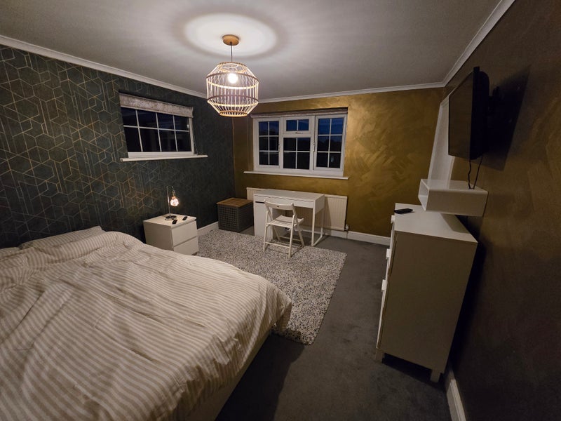 Double sized rental room in a large refurbished modern family home available immediately. King size bed with new bedding, built in wardrobe, TV with new DVD player and amazon firestick (own account required). There is a chest of drawers, a desk, bedside cabinet and blanket box.