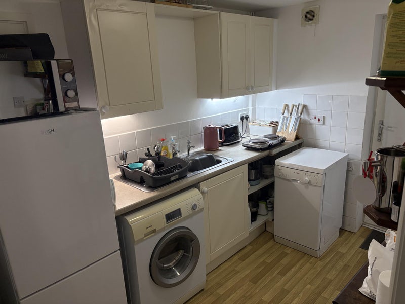 Private bathroom with shower, basin and toilet. Small kitchen area with space for a table and chairs, including cooker, washing machine and fridge.