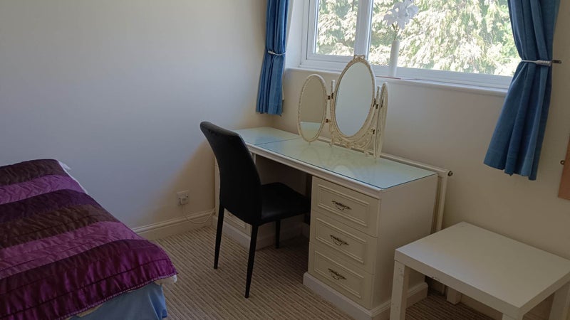 A double bedroom (10.1 sq metres) available for single occupant to rent in a 3 bedroom semi-detached house located in quiet Farnborough cul-de-sac. Room is furnished with double bed, 1 double wardrobe, 1 chest of drawers with 5 drawers, 1 bedside table, and 1 large desk with drawers.