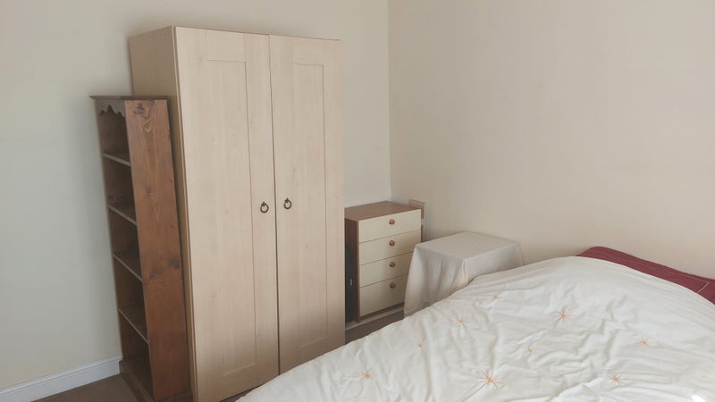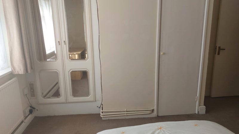A double bedroom is available for single occupant to rent in a 2 bedroom ground floor flat located in Farnborough. Room is furnished with double bed, 1 double wardrobe, 1 built in wardrobe, 1 built in airing cupboard, 1 chest of drawers with 3 drawers, 1 small bookshelf, and 1 desk with drawers.