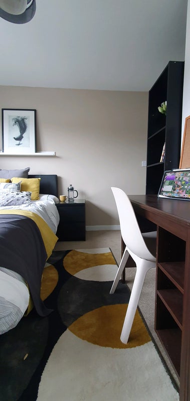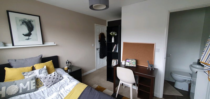 The room is furnished to a high quality with double ottoman bed, large wardrobe, chest of drawers, desk & bedside table. Own TV aerial point, multiple electrical sockets and room has own ethernet point in addition to high speed WiFi. The room has a very large window letting in plenty if light.