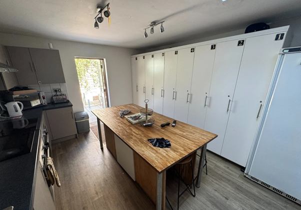 The house has a large communal kitchen with a central island, plenty of cupboard space (including a floor-to-near-ceiling cupboard allocated for your use), and a combined lounge/kitchen area with a full TV package.