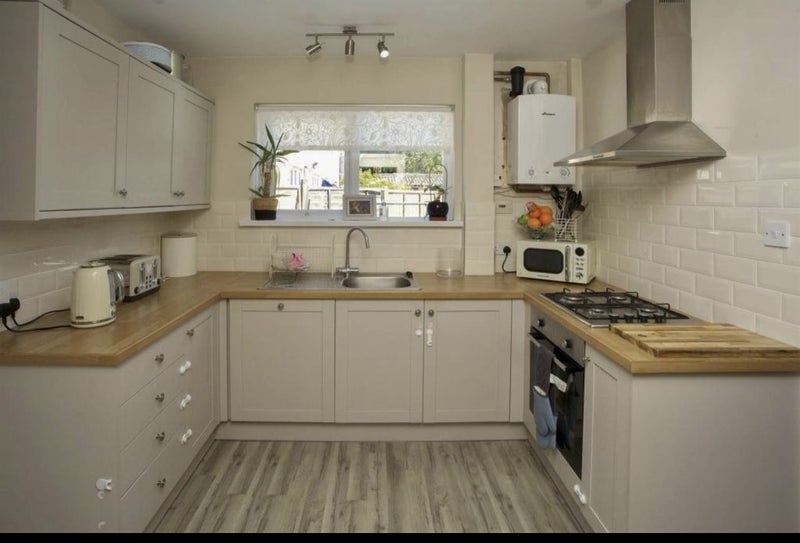 The kitchen is fully equip with microwave, kettle, fridge, washing machines, oven and hob and fully stocked with pans, plates and cutlery etc.